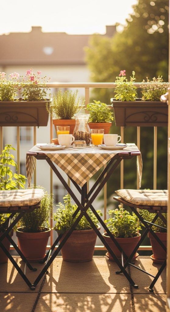 Use a foldable table and two chairs for morning coffee or evening chats. Opt for wrought iron or wood for charm.