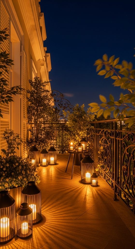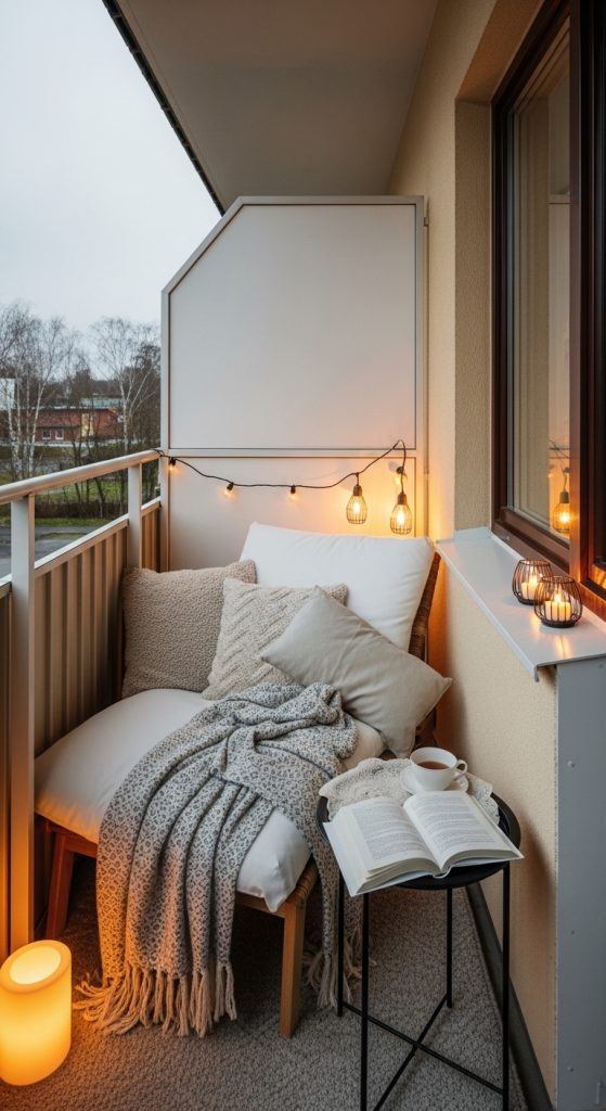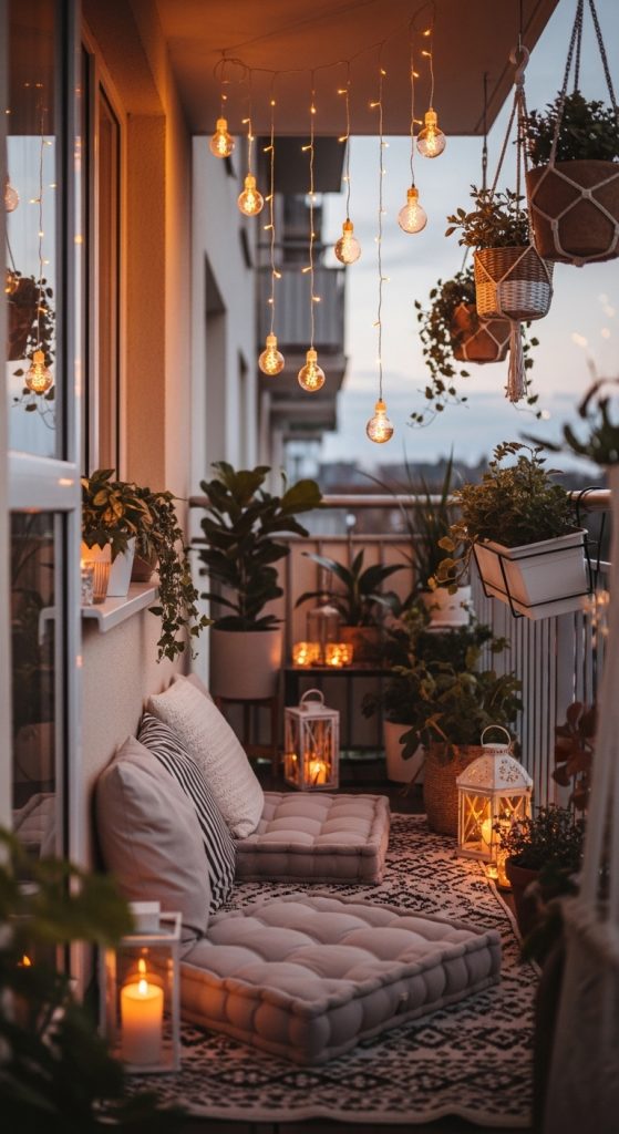 String up fairy lights or Edison bulbs for warm ambiance. They instantly make the balcony feel magical—especially at night.