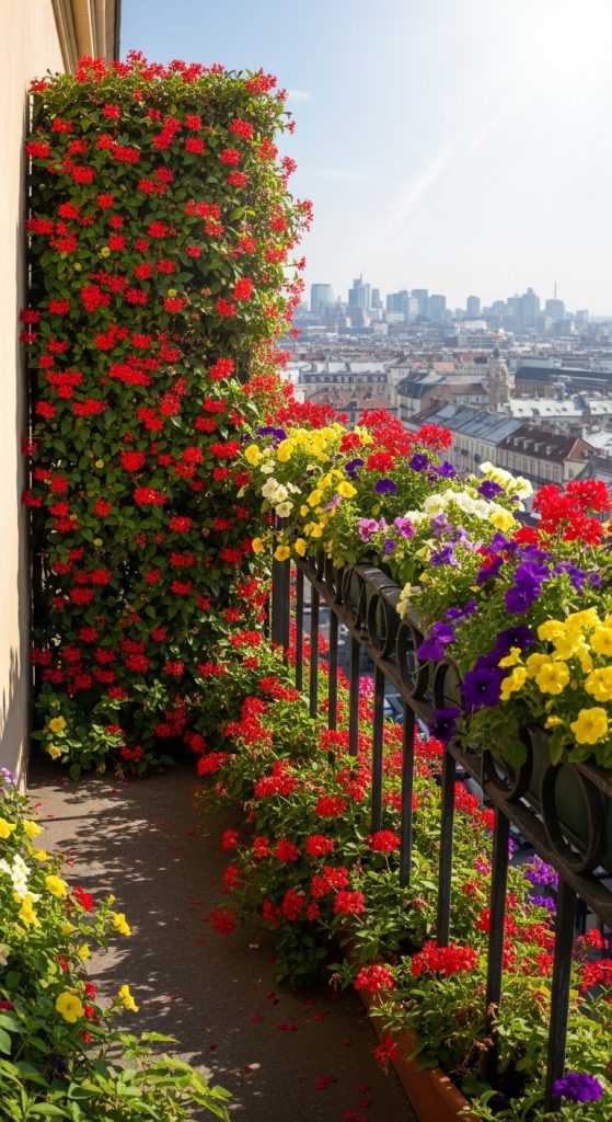 Attach flower boxes to the balcony railing filled with seasonal blooms or herbs like basil, mint, and lavender.