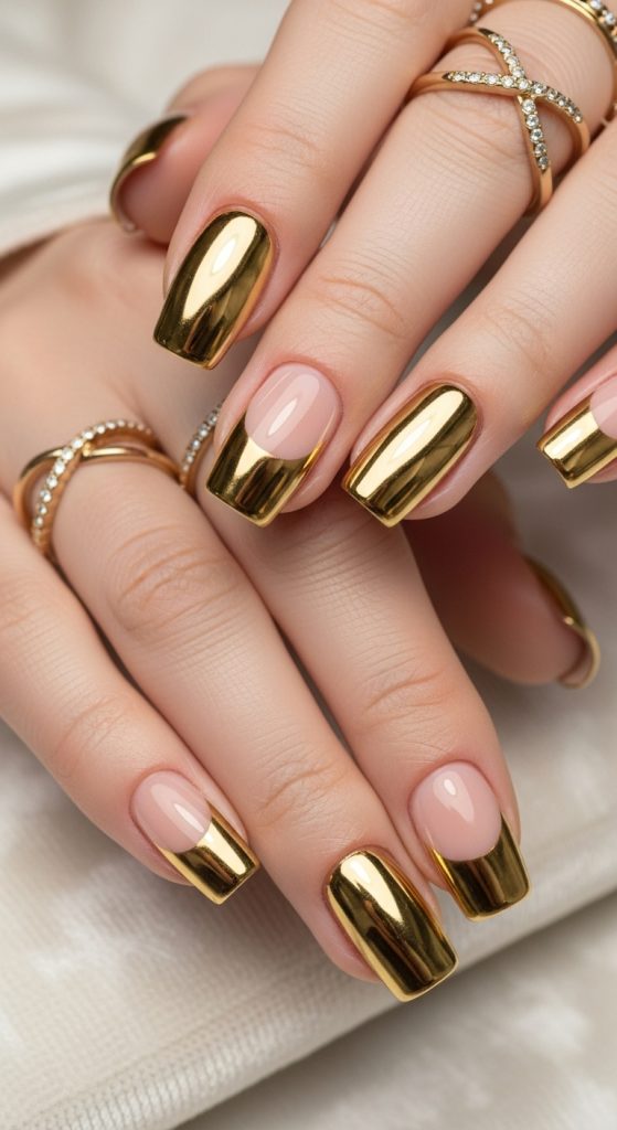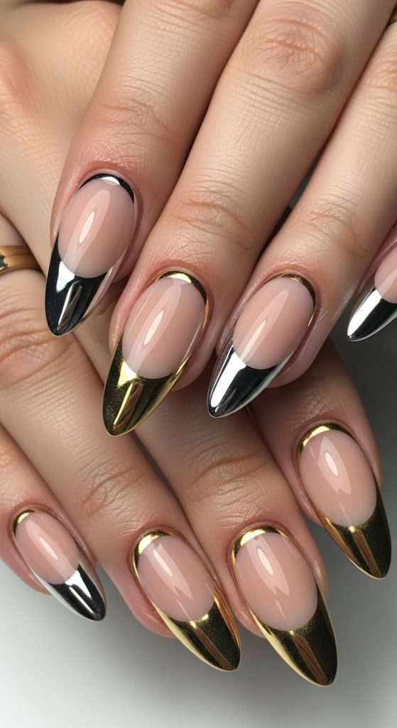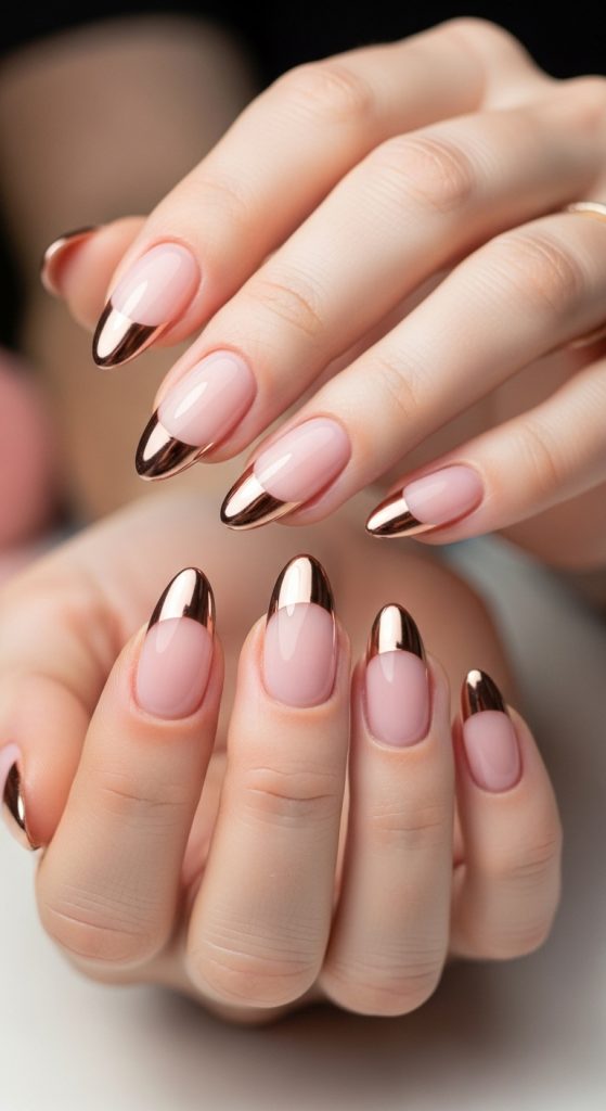 Soft, feminine, and chic—rose gold chrome tips are ideal for those who want a romantic twist on the French manicure. Pair it with a light pink base for a dreamy finish.