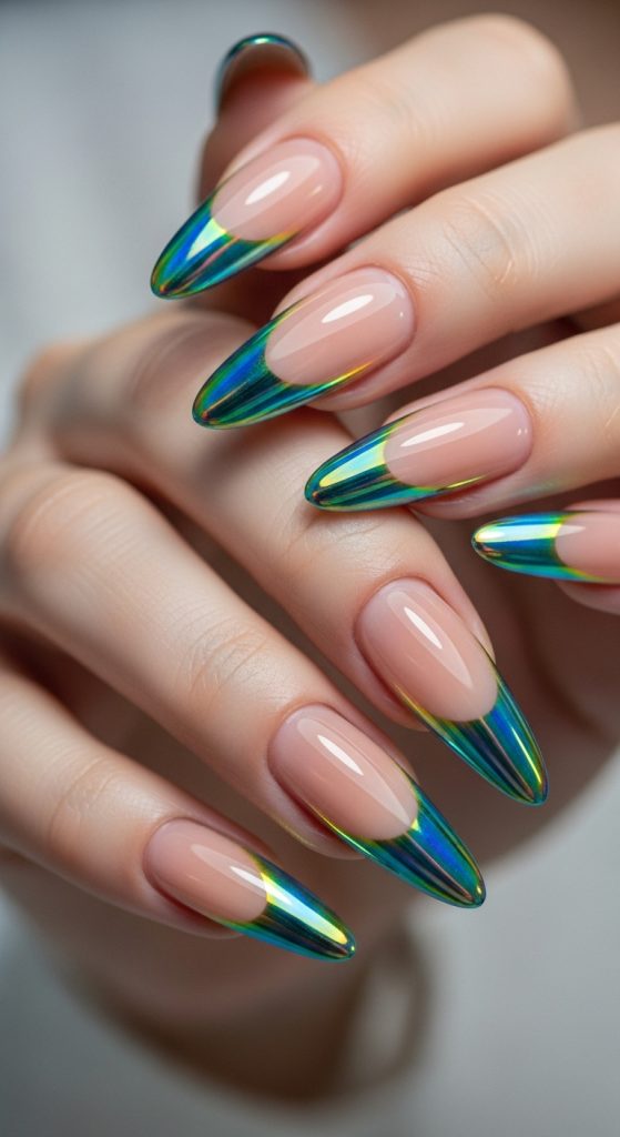 Why settle for one color when you can have them all? Holographic chrome tips shift colors under the light, creating a rainbow effect.