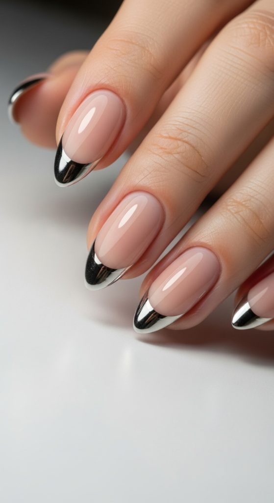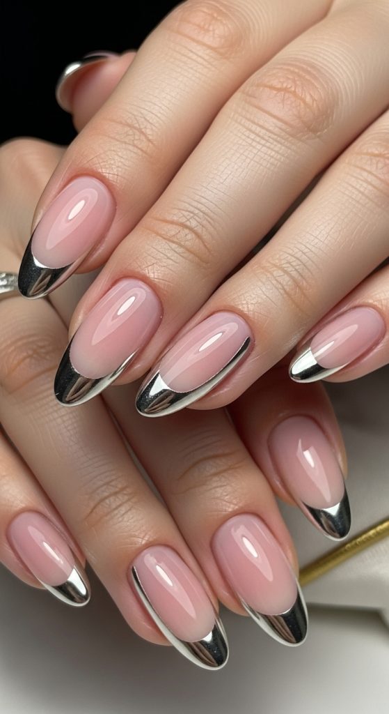 The original and most iconic look—thin silver chrome tips on a nude or sheer pink base. It’s sleek, versatile, and goes with any outfit.