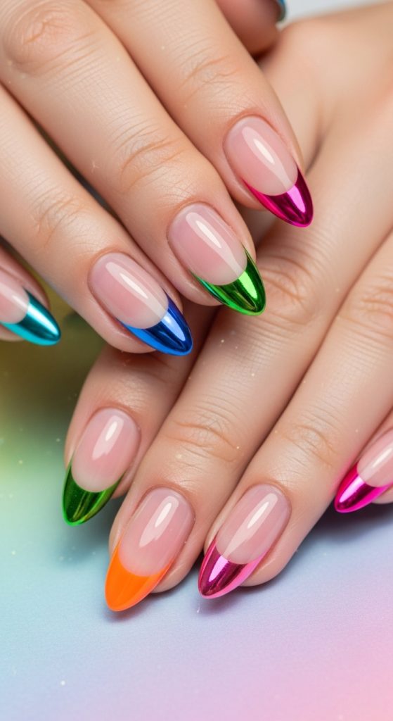 Who says French tips have to be white or metallic? Try vibrant chrome shades like blue, purple, or green for a fun and playful manicure.
