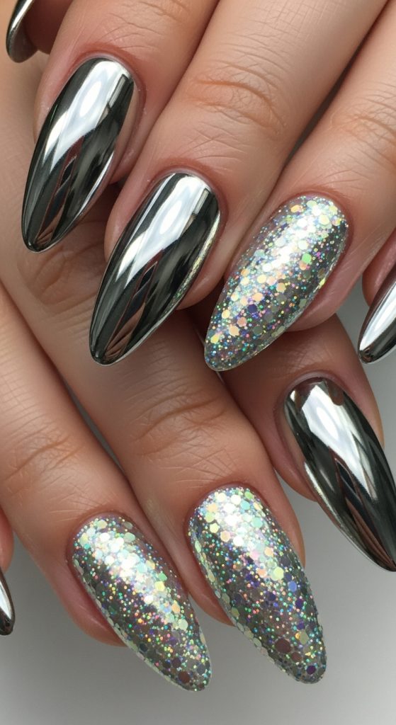 Mix the shine of chrome with the sparkle of glitter. Add glitter to a few accent nails or layer it over the chrome tips for extra glam.