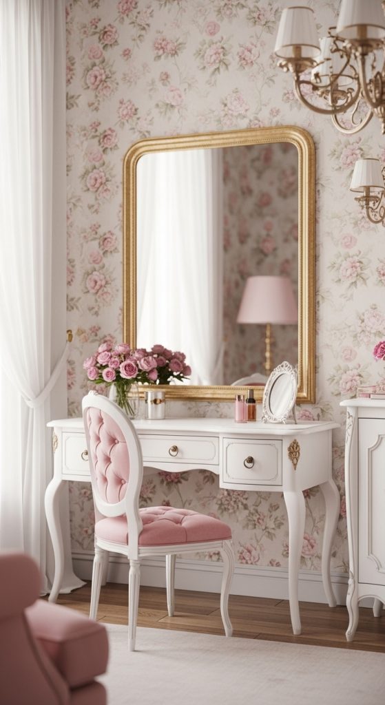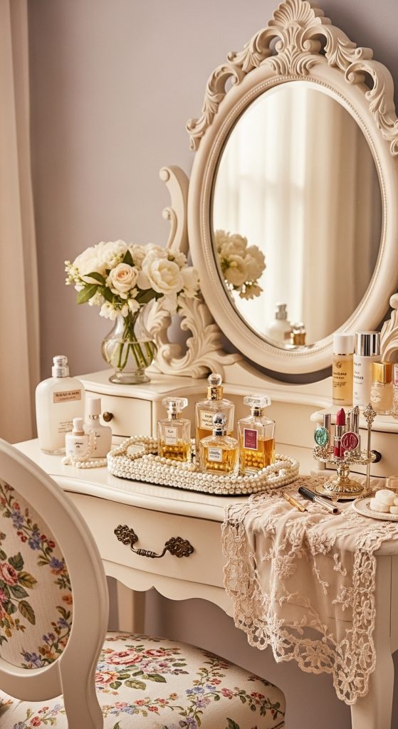 A coquette room isn’t complete without a vintage-style vanity. Style it with ornate mirrors, pearl-trimmed trays, vintage perfume bottles, lipstick stands, and a small floral chair.
