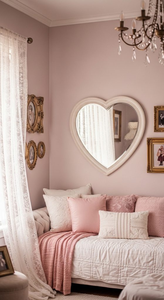 Add heart-shaped mirrors, throw pillows, trays, or photo frames. These subtle nods to love and romance make the space feel personalized and sweet — like a cozy fairytale room.