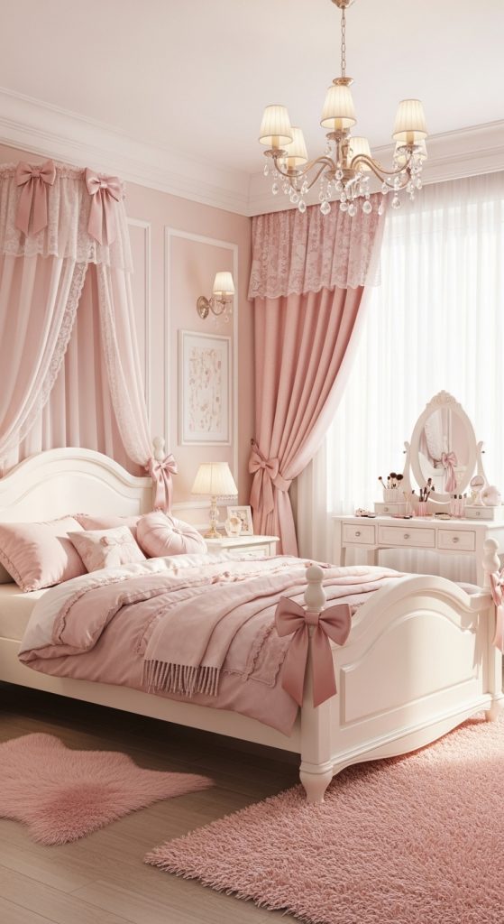 Bows are a signature coquette detail. Tie satin ribbons on curtain ties, drawer handles, bedposts, or use bow-shaped wall hooks and pillows. Pink or ivory bows add a whimsical, playful touch.