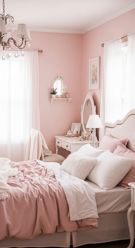 Start with a soft base — think blush pink, creamy whites, lilac, and baby blue. These delicate shades set the tone for a room that feels light, airy, and gentle. Use them in your wall paint, bedding, curtains, and accents.