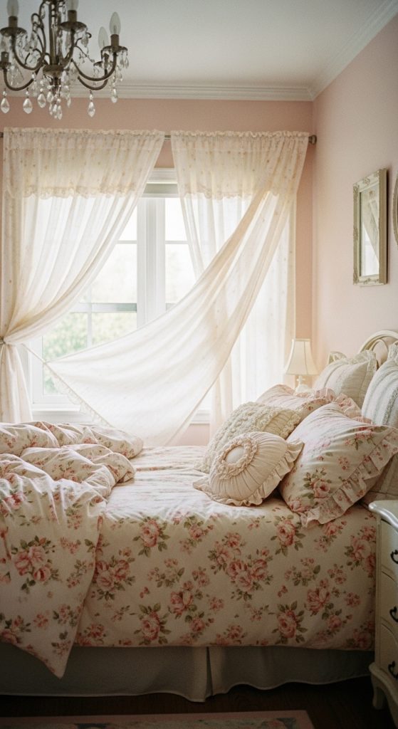 Romantic floral prints are a must. Opt for dainty rose patterns or watercolor florals on your bedsheets, comforters, and curtains. Soft, flowing fabrics like chiffon or lace will enhance the delicate vibe.