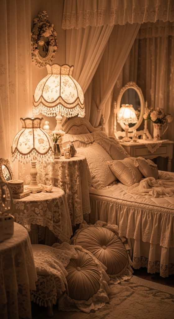 Details make the coquette aesthetic magical. Incorporate lace doilies, frilly pillowcases, ruffled bed skirts, or lace-trimmed lampshades for a sweet, vintage touch that feels ultra-girly.