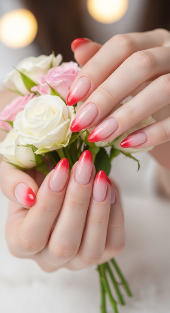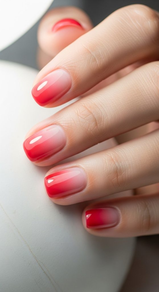 Subtle red ombre nails start with a clear or nude base, gently fading into red tips. This delicate gradient creates a dreamy, feminine effect—perfect for romantic occasions or when you want nails that stand out softly.