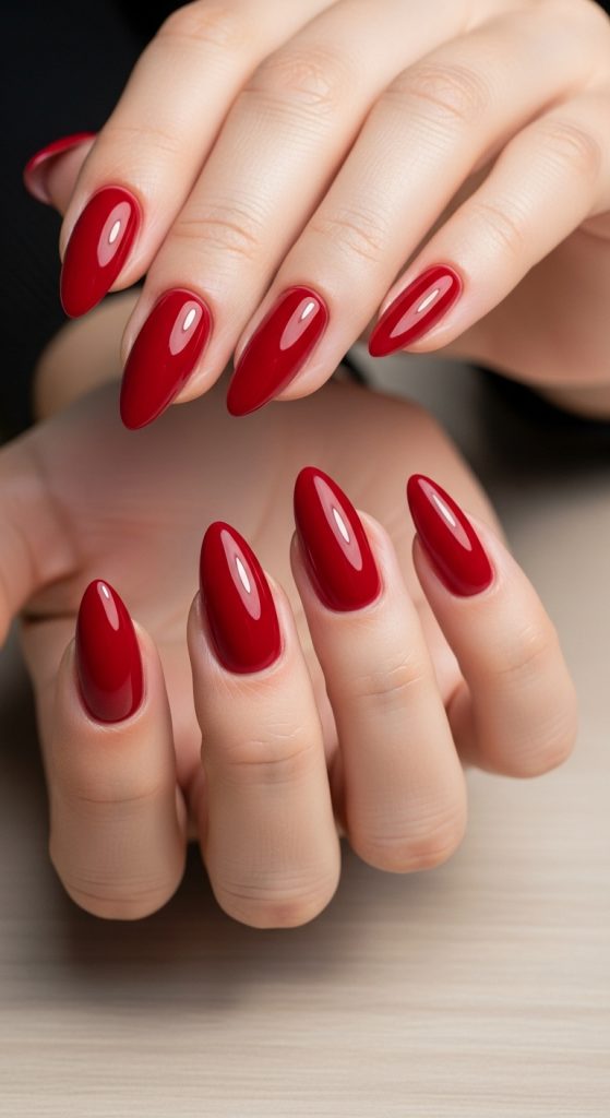 Almond-shaped nails coated with deep, glossy red polish offer elegance without excess. The shape elongates the fingers, while the glossy shine keeps the design simple but eye-catching.