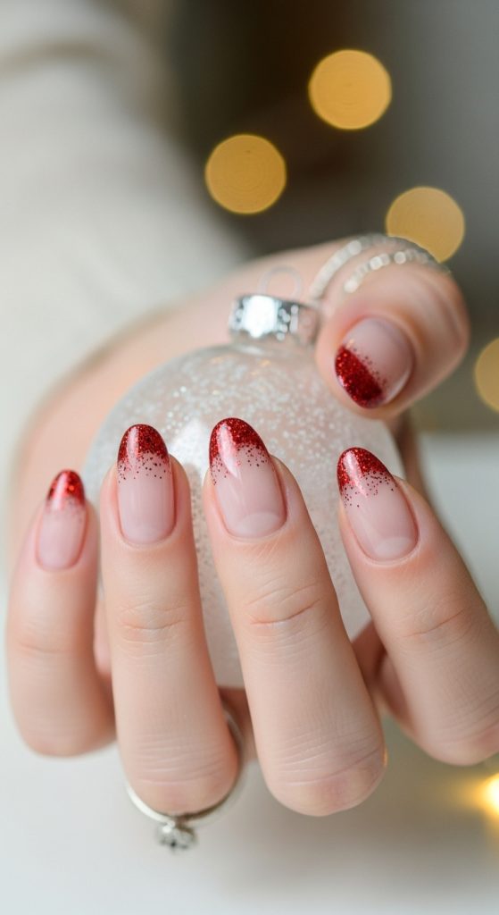 If you love a hint of sparkle but don’t want something too bold, go for subtle glittery red tips. This minimalist design keeps things delicate yet festive, suitable for both casual and special gatherings.