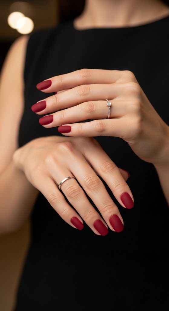 Matte finishes transform a classic red into something more sophisticated and understated. The soft, velvety texture looks refined and modern, making it a great choice for evenings or professional settings.