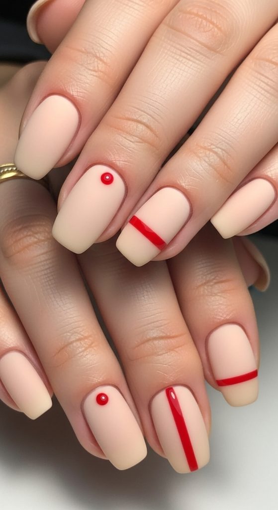 Pairing a nude base with tiny red details, like dots or a single thin stripe, creates a minimal yet creative nail look. This style is subtle but still adds that pop of red that symbolizes confidence.