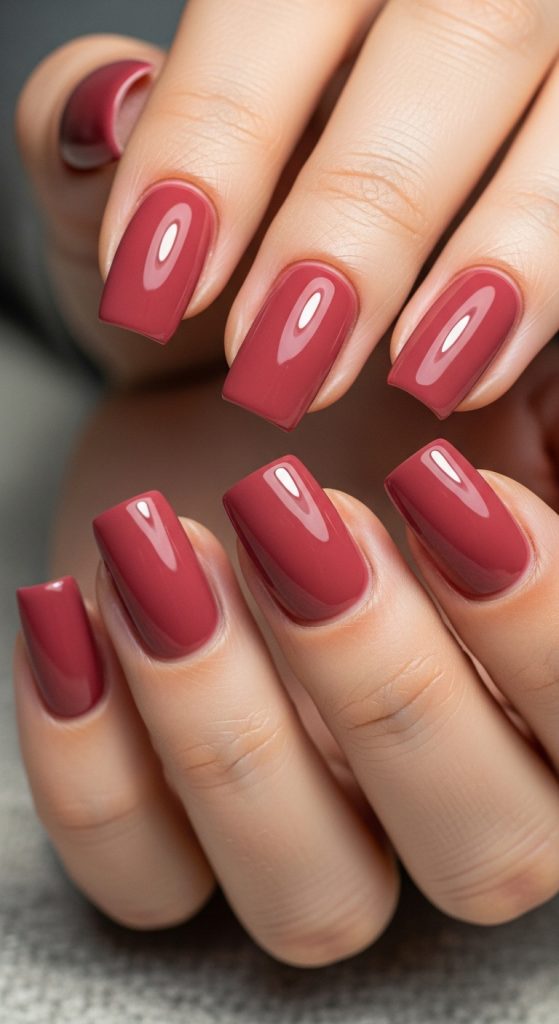 Crimson tones are slightly muted compared to bright red, making them perfect for a subtle look. Painted on neatly filed square nails, they give a clean, modern finish that works for every occasion.