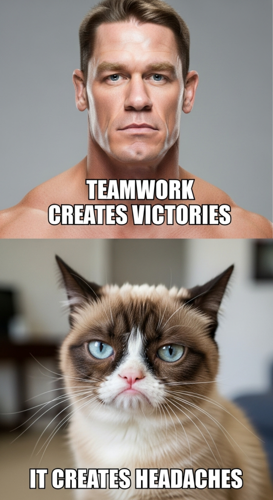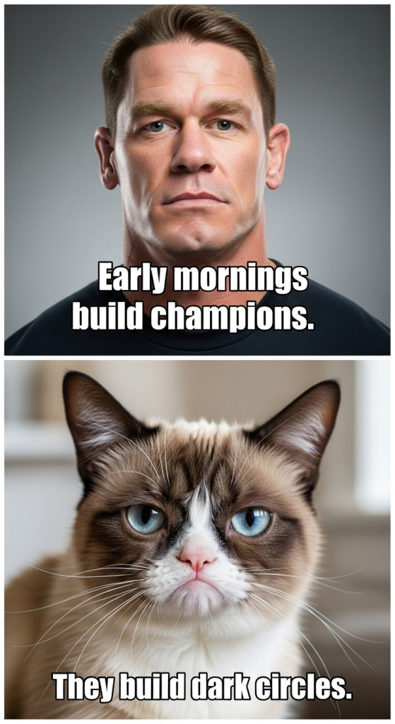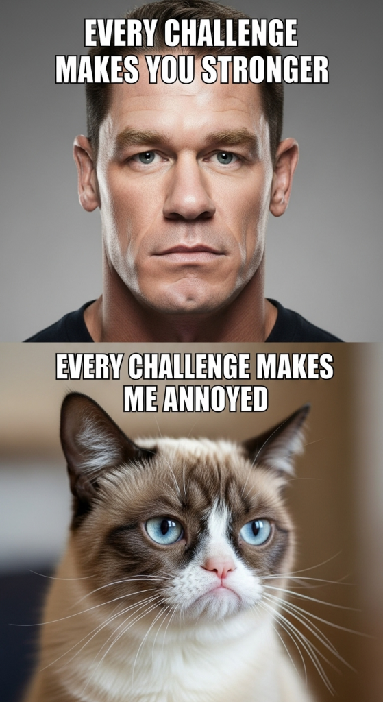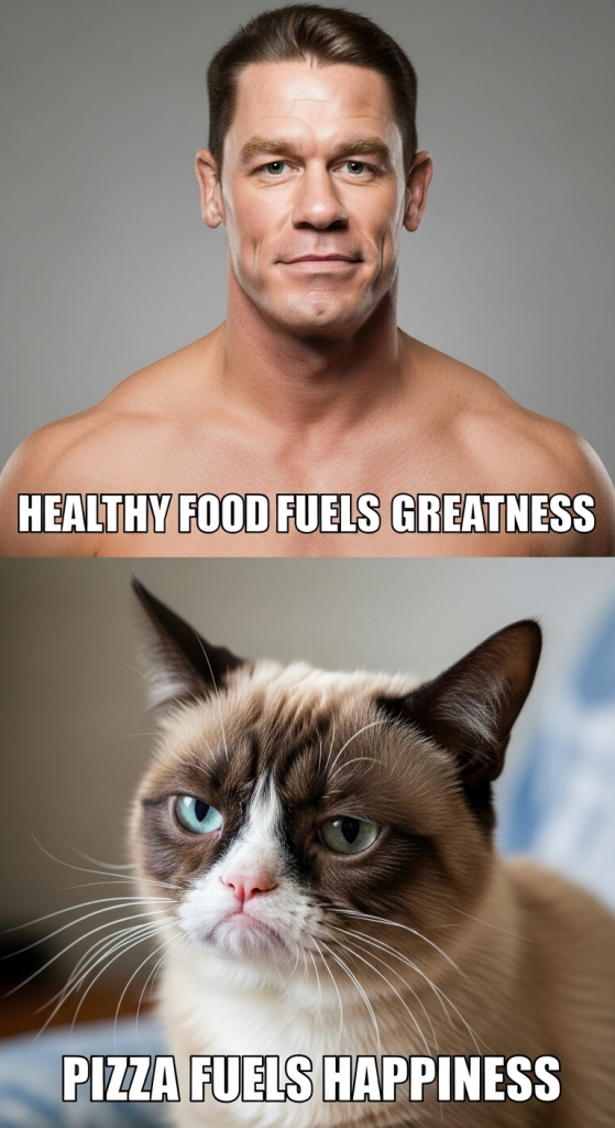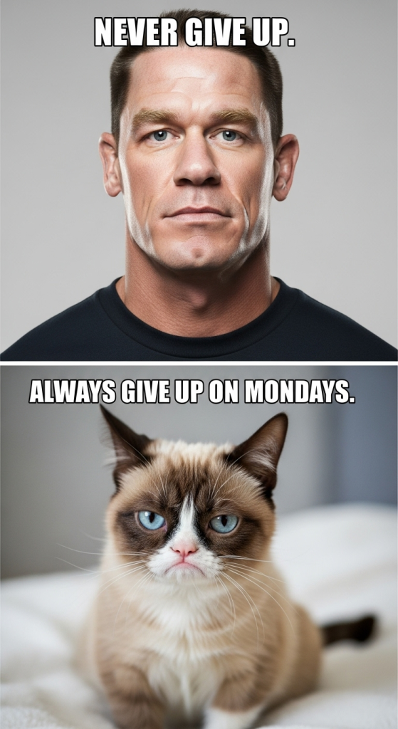This contrast is what makes the two-panel memes so funny and relatable. While John Cena inspires with his larger-than-life personality, Grumpy Cat shuts it all down with one-liners that reflect the struggles of everyday life. Whether it’s about Mondays, teamwork, healthy habits, or pushing through challenges, these memes highlight the gap between motivational advice and real-life feelings in the funniest way possible.