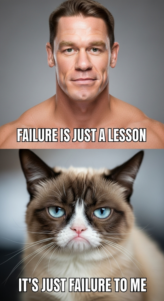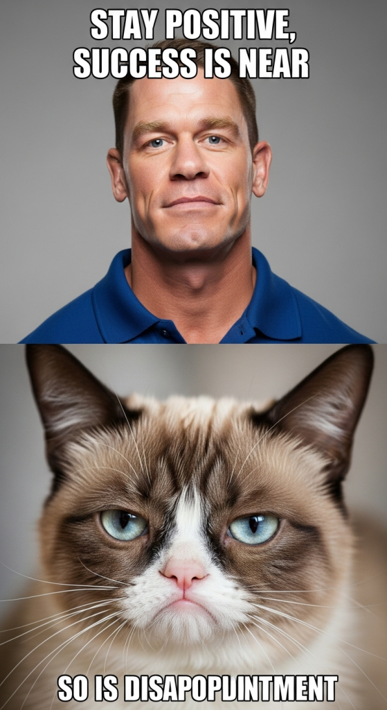 If you’ve ever laughed at the irony of trying to “stay positive” while everything goes wrong, or rolled your eyes at phrases like “hard work pays off,” these John Cena + Grumpy Cat relatable memes are made just for you. They’re the perfect balance of inspiration and sarcasm—exactly what the internet loves.